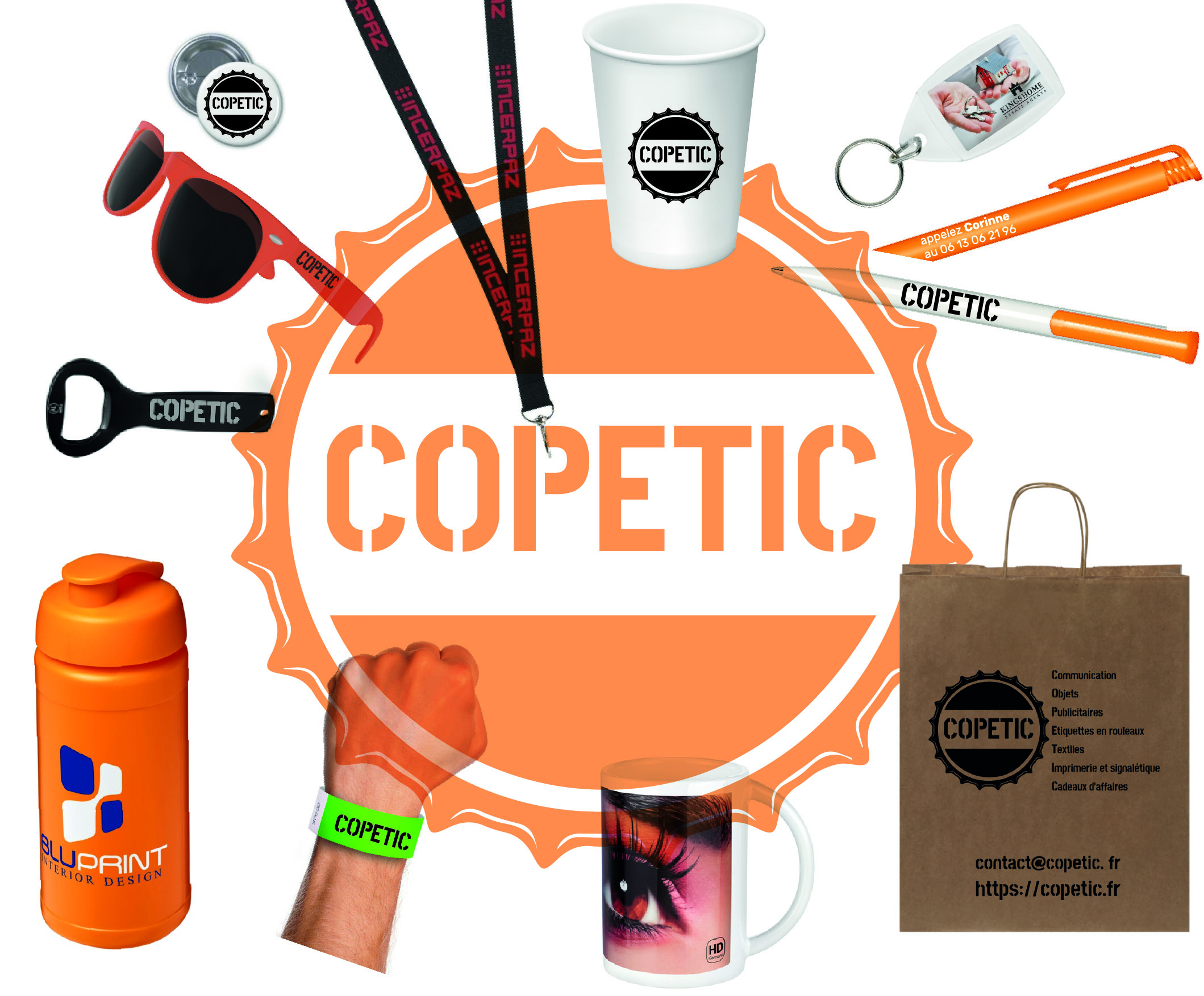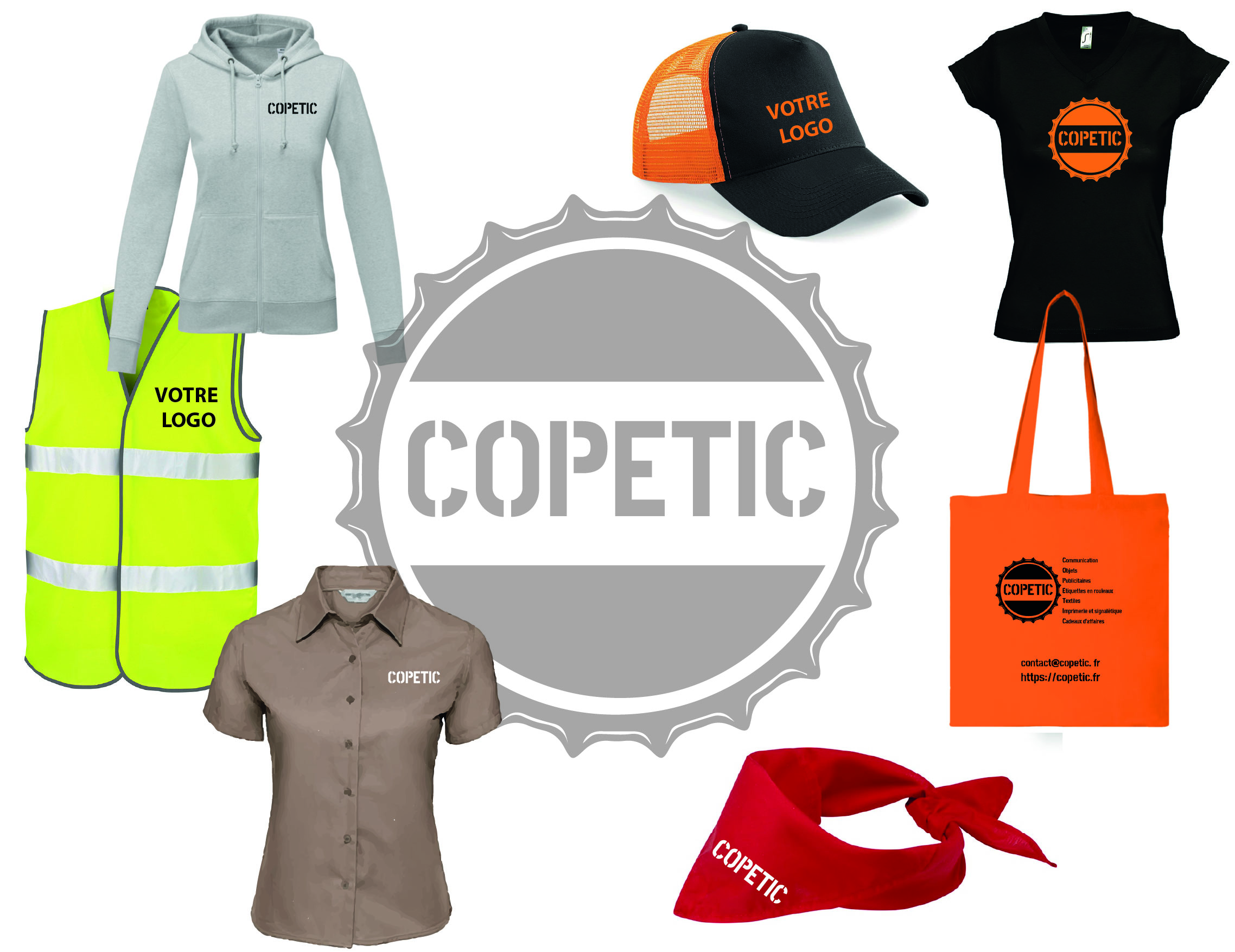 Goodies personnalisés, objets et textiles publicitaires, étiquettes en rouleaux, imprimerie, signalétique et cadeaux d’affaires.